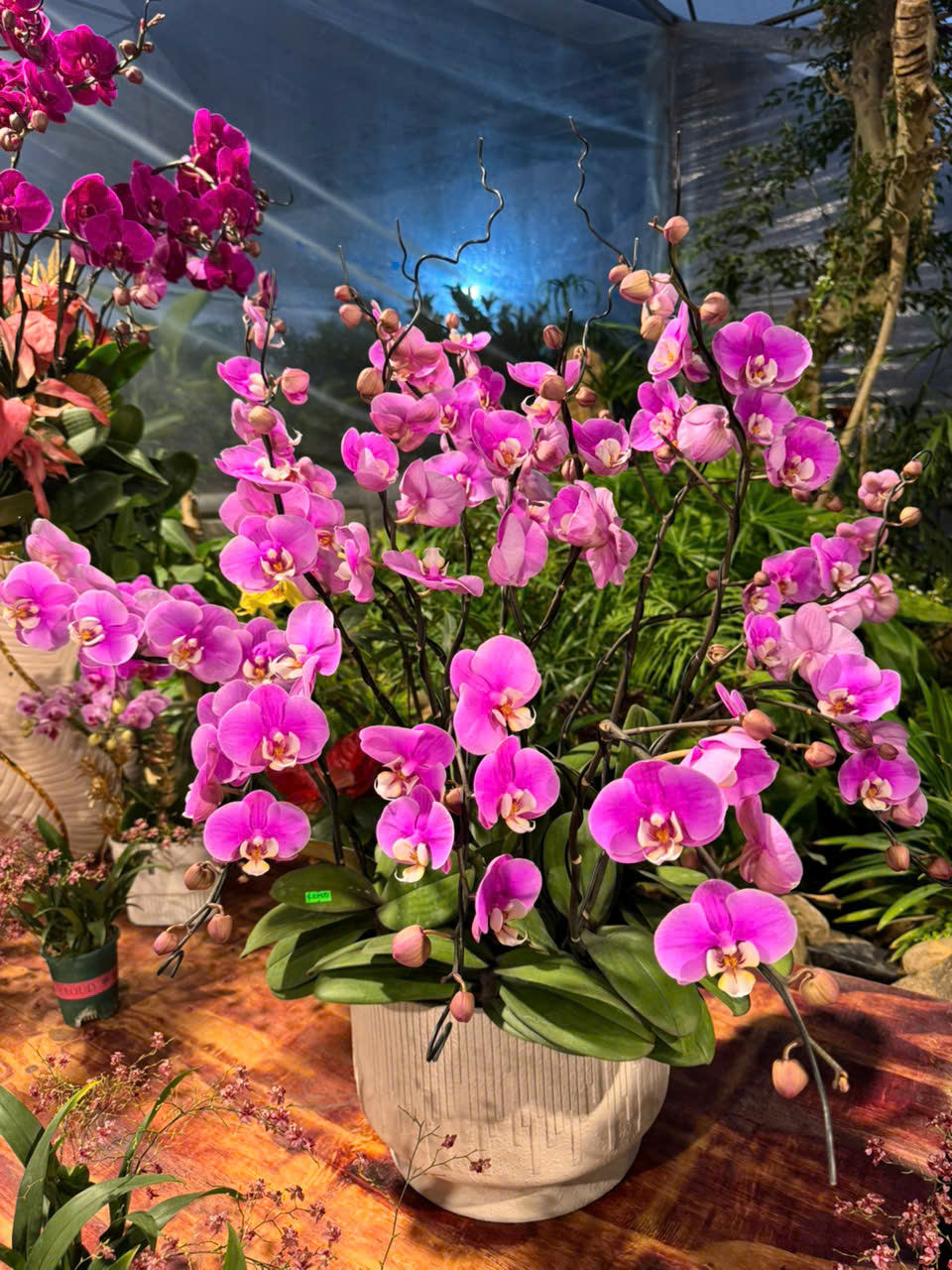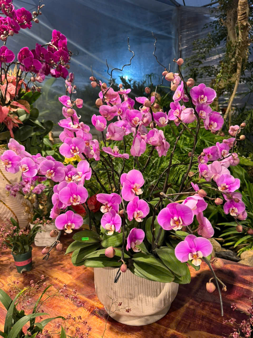 Mỗi chậu lan được thiết kế độc đáo, hài hòa giữa cành hoa, dáng chậu và các phụ kiện trang trí cao cấp, tạo nên một kiệt tác nghệ thuật, phù hợp để tặng người thân, đối tác hoặc trang trí không gian Tết.